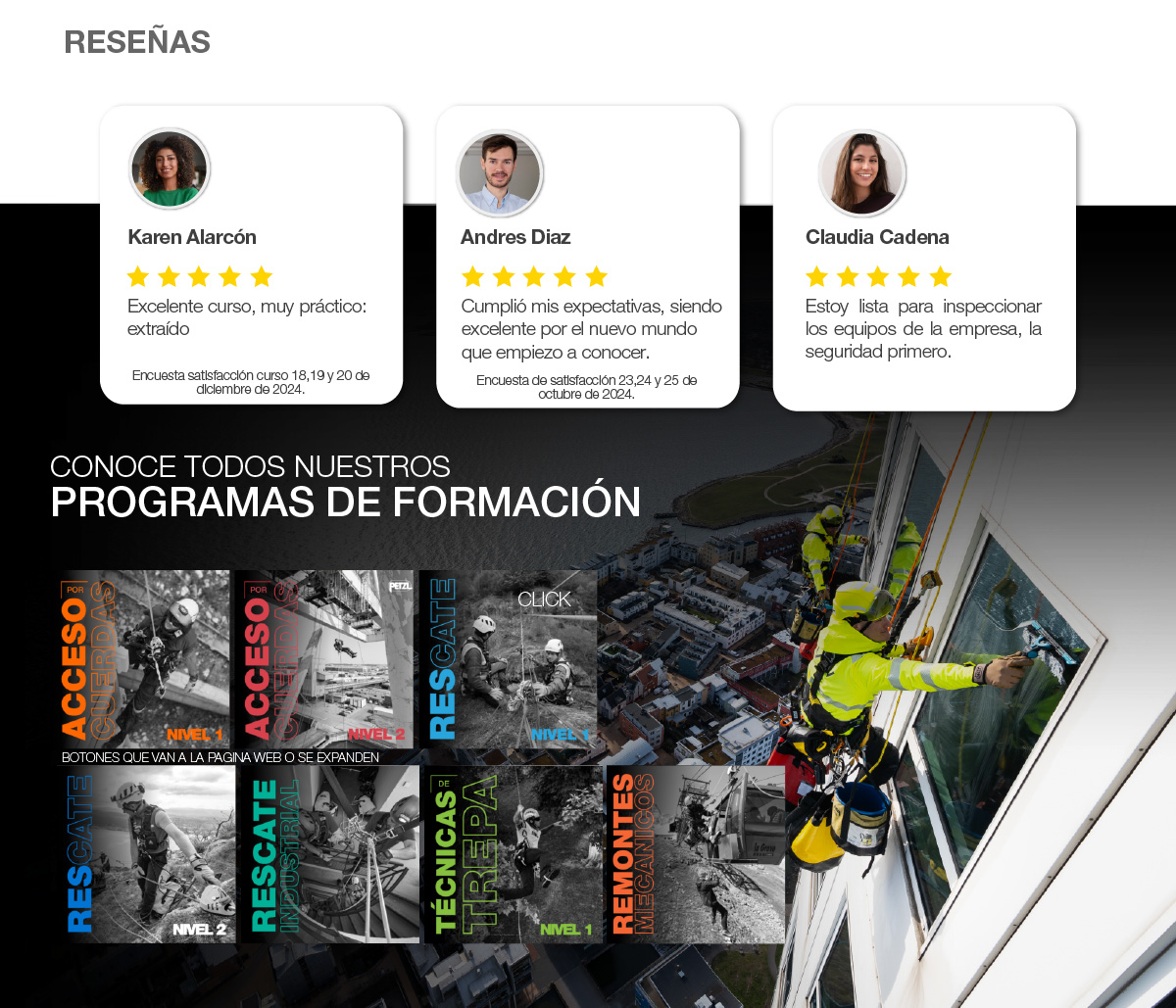 Contamos con un moderno centro de formación y entrenamiento para trabajo seguro en alturas en la ciudad de Bogotá. Dirigido por un experimentado personal de apoyo, debidamente certificado, lo que nos permite difundir un conocimiento integral en los procedimientos estipulados por la normatividad y el manejo de una amplia y selecta gama de equipos. Nuestra red de distribución alcanza una alta cobertura en el país y está consolidada en diferentes ciudades, donde se destacan entidades de rescate, industria minera, construcción e hidrocarburos, al igual que en el campo deportivo a través de parques de aventura y actividades de montaña.
